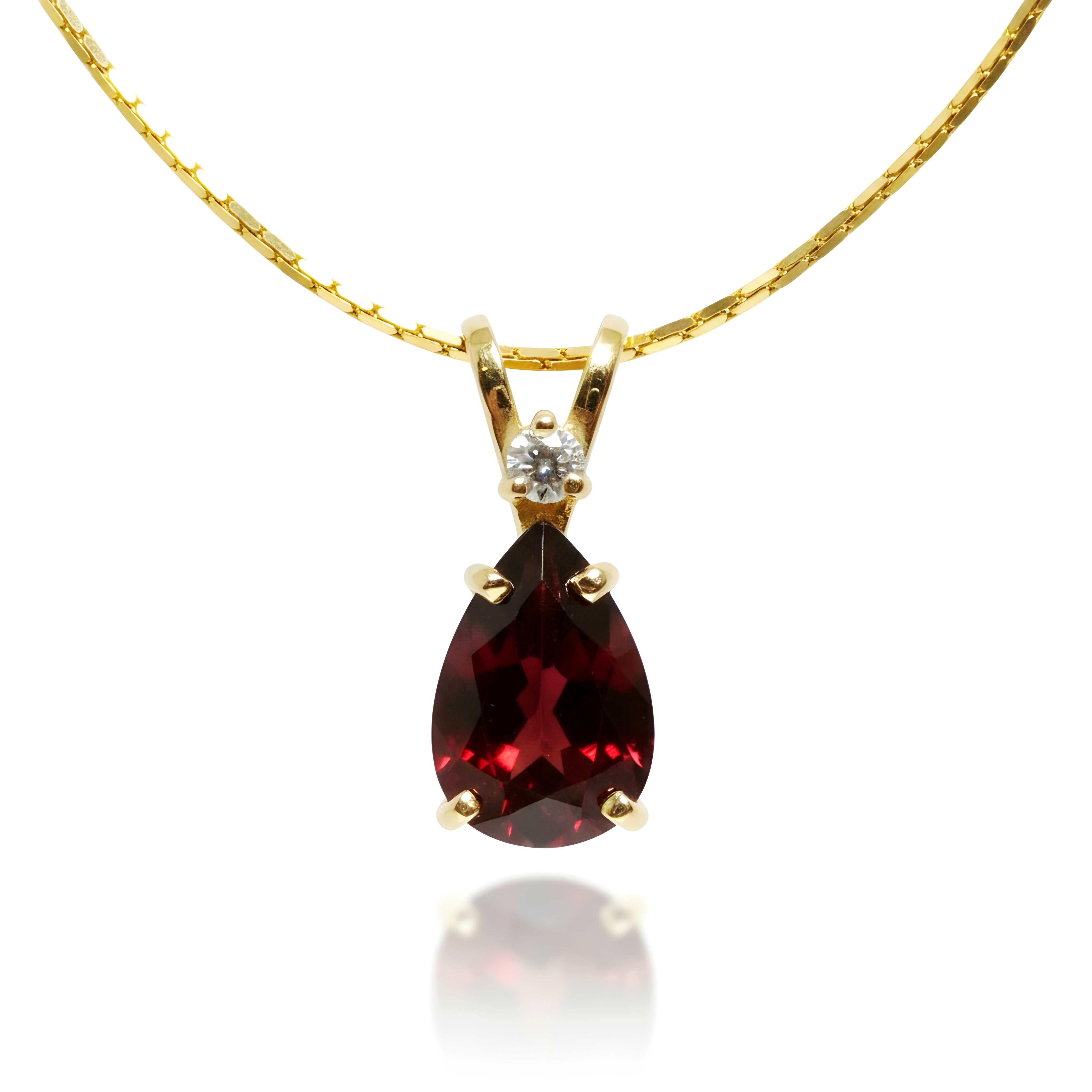 Lady's yellow 14 karat rabbit ear pendant with one 1.93ct pear red garnet and one 0.05ct round G SI1 diamond.