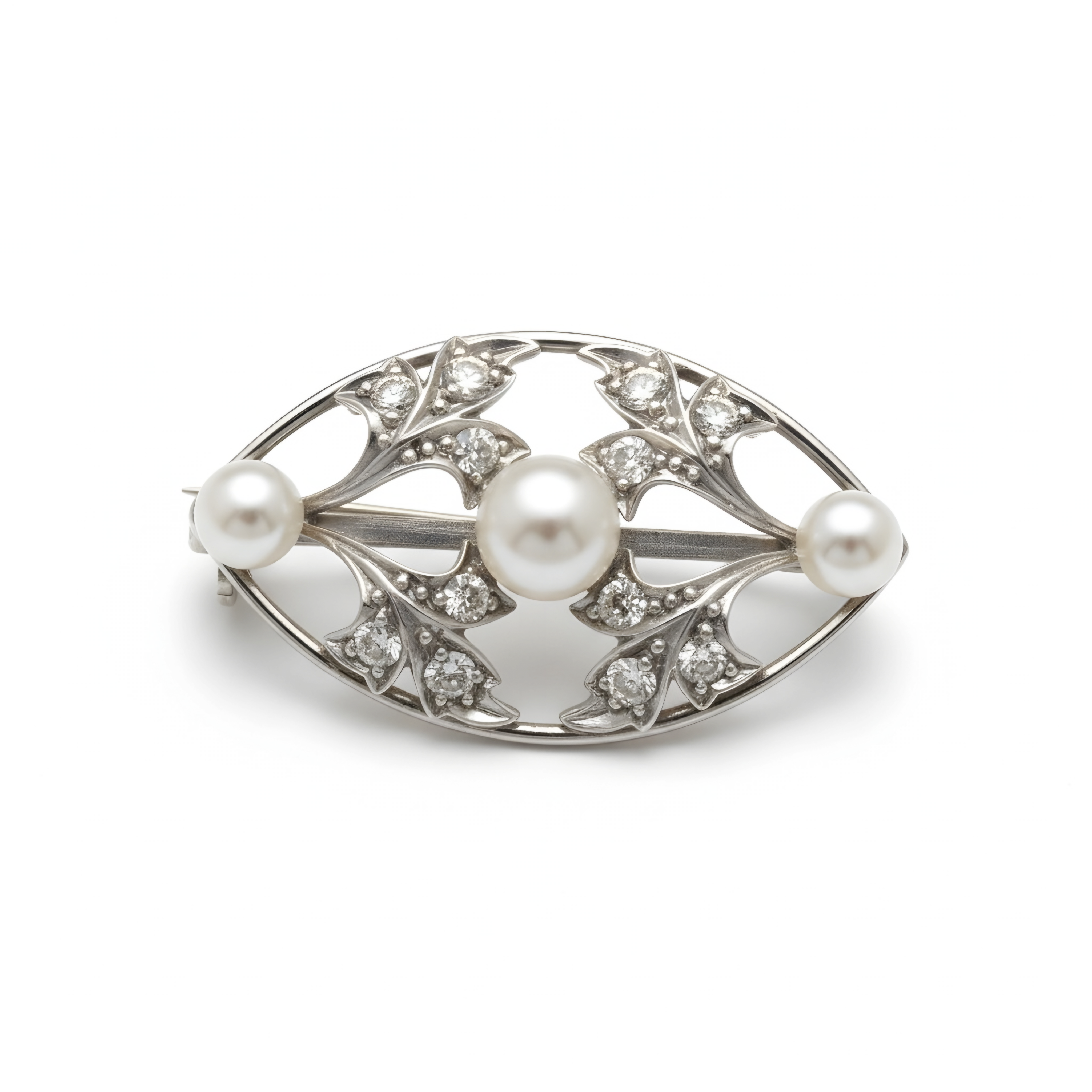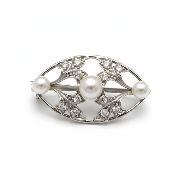 Vintage lady's white platinum pin with 3=4.05-5.50mm potato South Sea pearls and 12 approximately 0.30tw European G/H VS2/SI1 diamonds. Circa 1910s'.