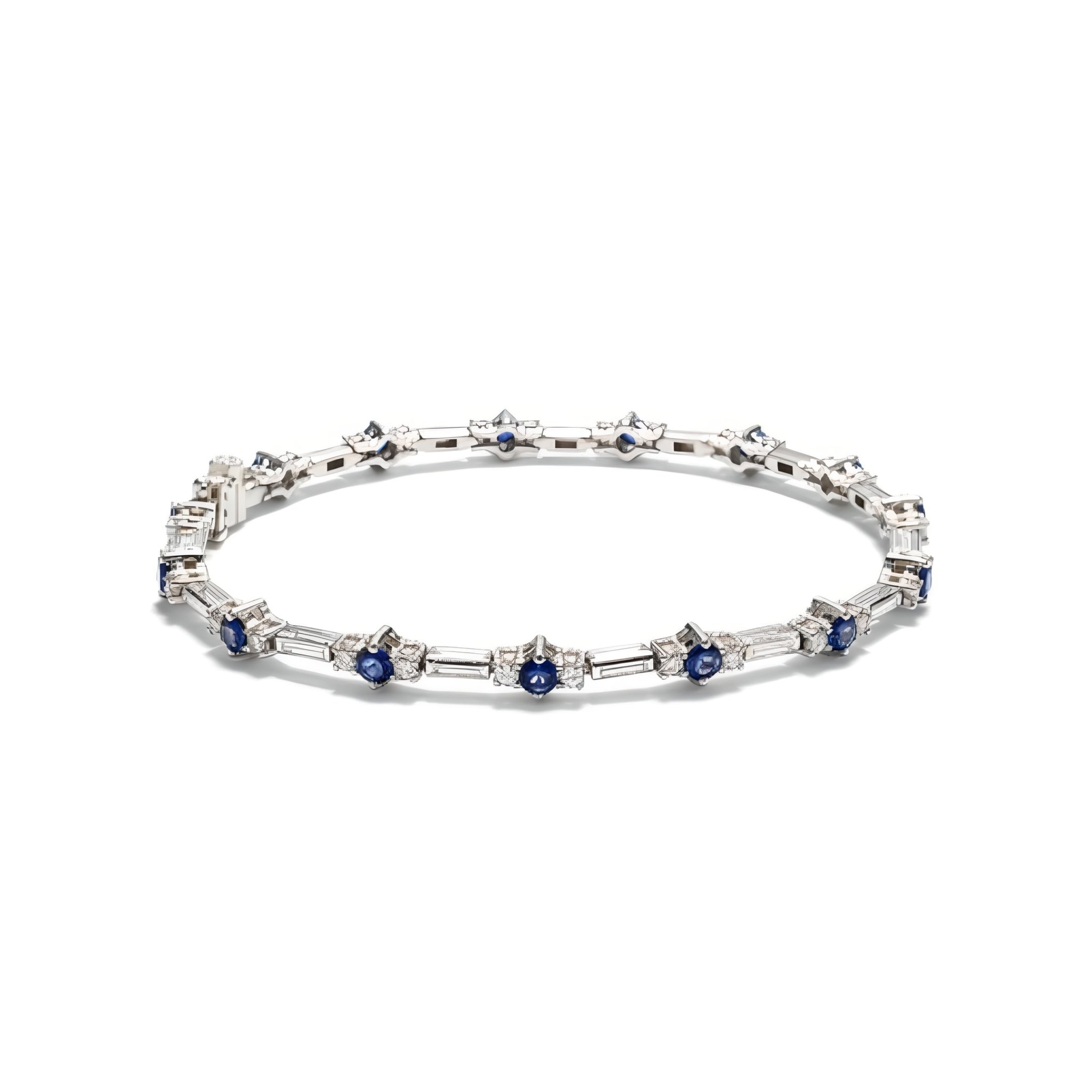 Ladies white 14 Karat diamond cut Ceylon blue sapphire and diamond fancy link bracelet is set with 14=1.70tw Ceylon blue sapphires and 28=0.54tw F VS2/SI1 round brilliant cut diamonds.