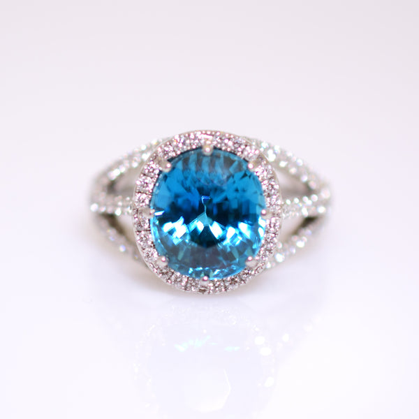 Lady's white 14 karat fashion ring with one approximately 6.00ct oval blue zircon and 84=0.75tw round G SI1/SI2 diamonds.