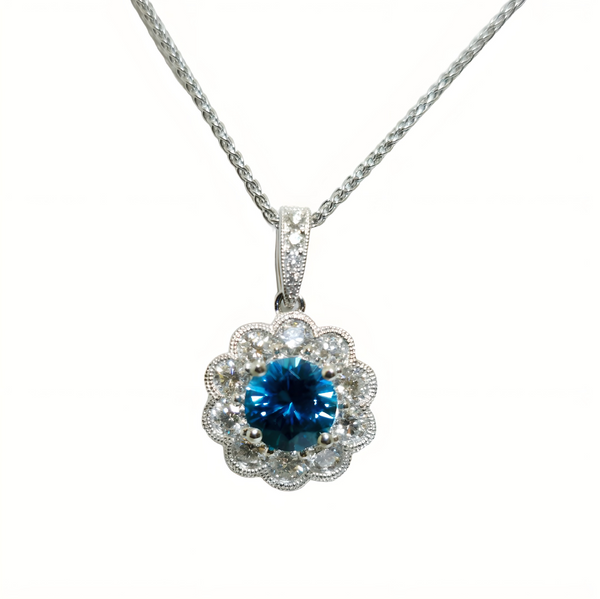 Lady's white 18 karat pendant with one 1.40ct round blue zircon and 15=0.62tw round F VS1/VS2 diamonds.
