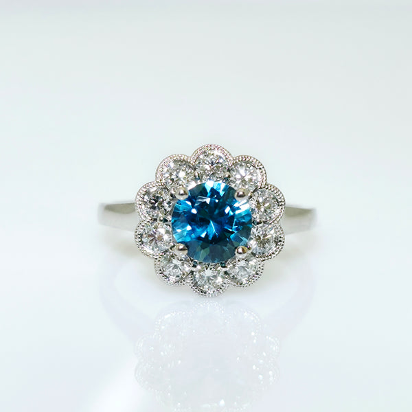 Lady's white 18 karat fashion ring with one 1.38ct round blue zircon and 10=0.65tw round F VS2/SI1 diamonds.