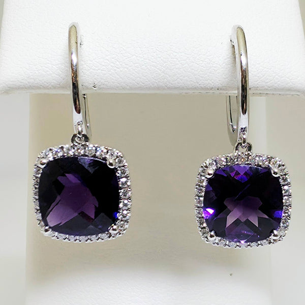 Lady's white 14 karat dangle earrings with 2=5.39tw square cushion amethysts and 56=0.25tw round G/H SI1/SI2 diamonds.