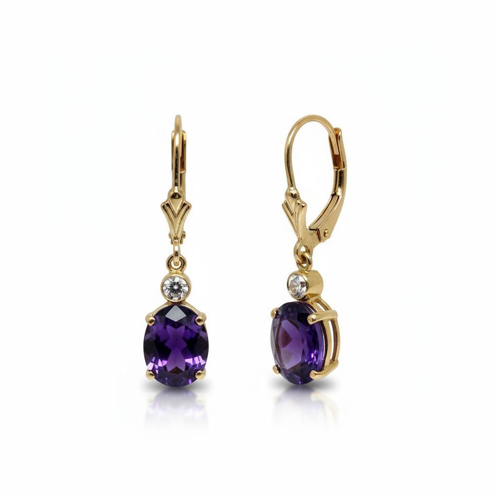 Lady's yellow 14 karat dangle earrings with 2=3.65tw oval amethysts and 2=0.15tw round g VS2/SI1 diamonds.