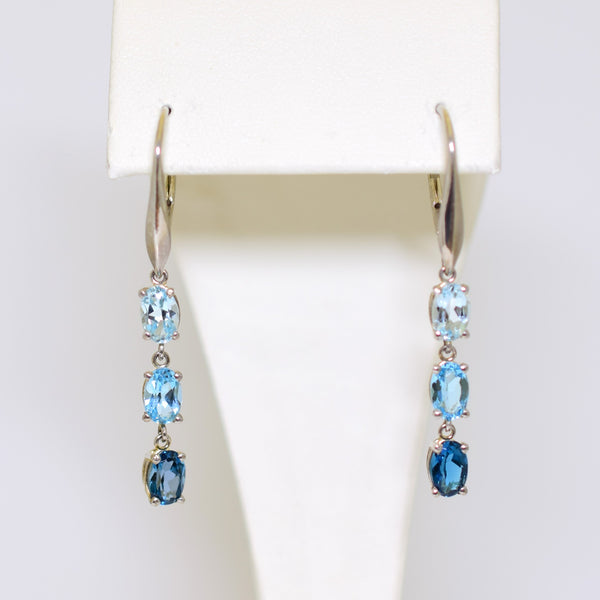 Lady's white sterling silver dangle earrings with 2=6.00x4.00mm oval light blue topazes, 2=6.00x4.00mm oval Swiss blue topazes, and 2=6.00x4.00mm oval London blue topazes.