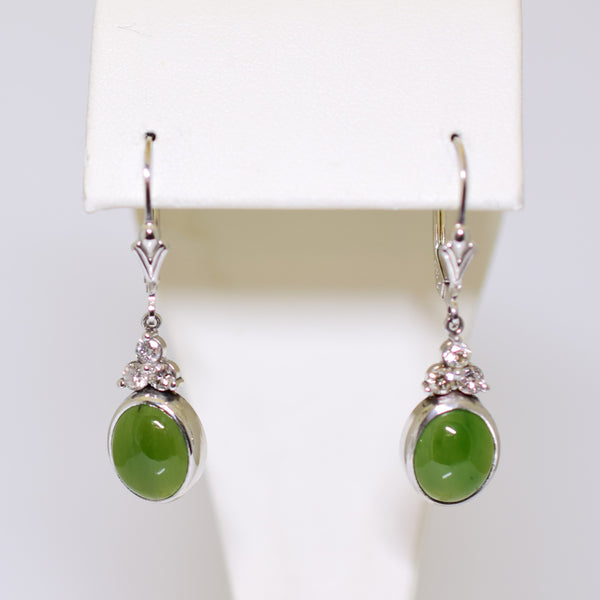 Lady's white sterling silver dangle earrings with 2=4.58tw cabochon jades and 6=0.37tw round H SI1/SI2 diamonds