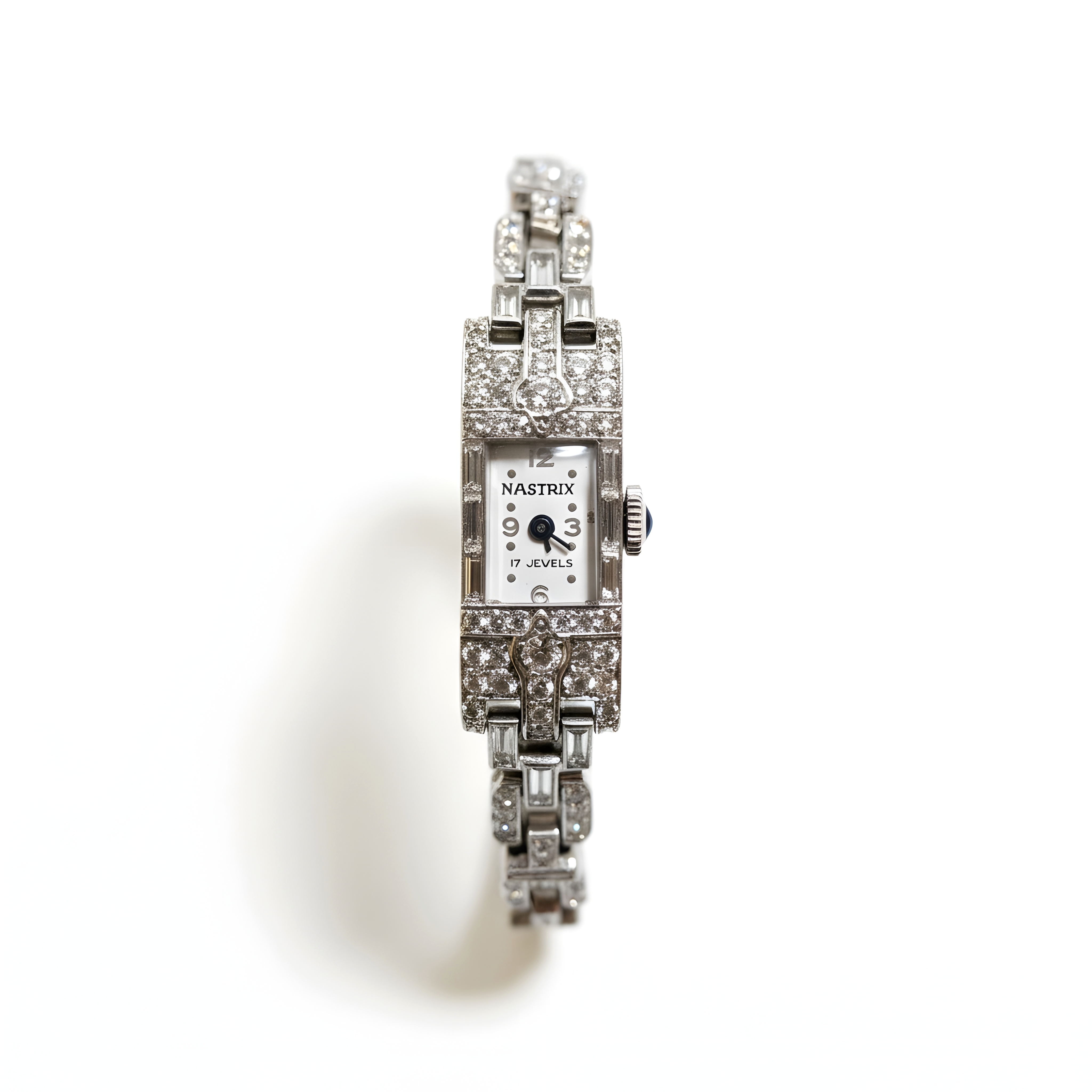 Vintage platinum dress watch with approximately 3.00tw various shapes F/G VS1/VS2 diamonds. Manufacturer: Nastrix