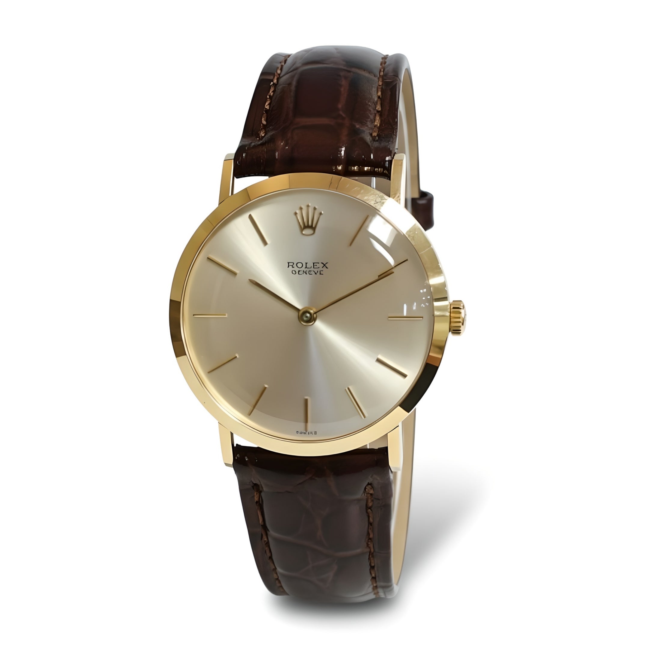 Vintage Rolex ultra thin manual wind dress model 18ky circa early 1960’s. 34 x 39mm screw down back case with smooth bezel and low dome acrylic crystal. 17 jewel manual wind movement with sweep seconds. Case #573400