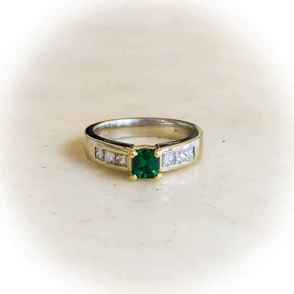 Lady's bi-color 14 karat contemporary fashion ring with one 0.78ct princess tsavorite garnet and 6=0.51tw square cushion G SI1 diamonds.