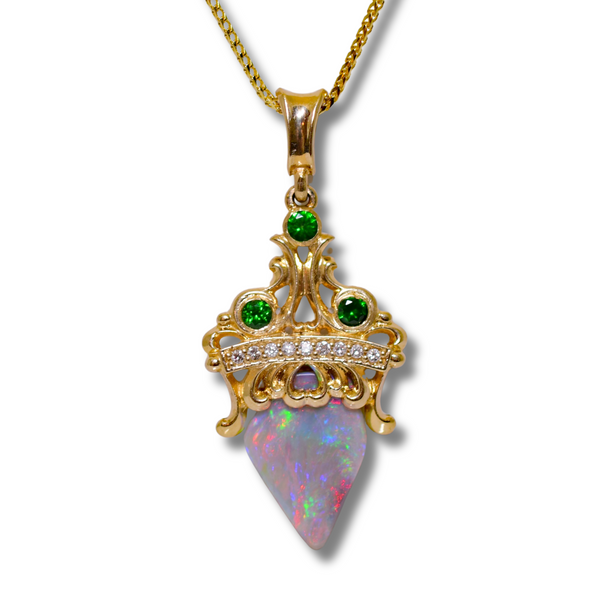 Custom 14ky Opal, Tsavorite Garnet and Diamond Pendant