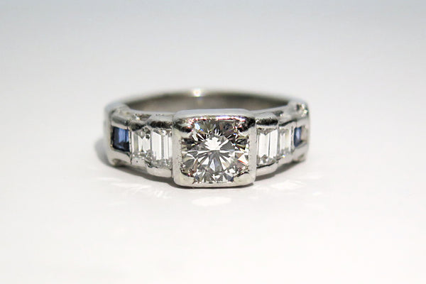 Custom platinum 1.17ct round brilliant cut diamond band accented with 0.75ct of diamonds on each shoulder finished with blue sapphire gemstones.