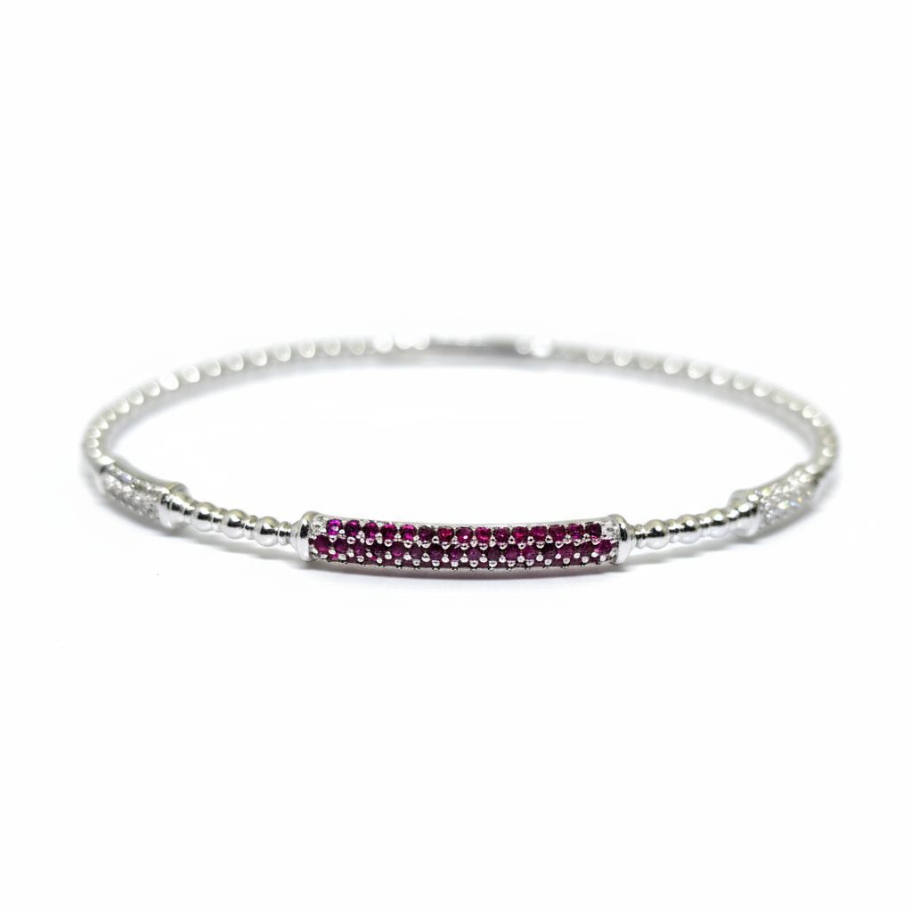 Lady's white 14 karat flexible bangle bracelet with 46=0.51tw round rubys and 32=0.25tw round I/J SI1/SI2 diamonds.