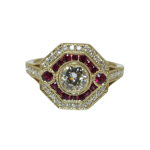 Lady's yellow 14 karat fashion ring with one 0.41ct round H VS2 diamond, 16=0.31tw round rubys and 38=0.29tw round G VS2/SI1 diamonds.