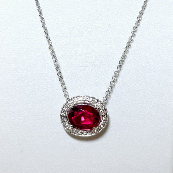 Lady's white 14 karat necklace with one 2.21ct oval pinkish red spinel and 24=0.18tw round G SI1 diamonds. Pendant is attached to 18" adjustable 1.4mm cable chain.