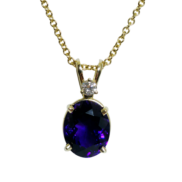 Lady's yellow 14 karat rabbit ear pendant with one 4.70ct oval amethyst and one 0.10ct round E/F VS2 diamond.