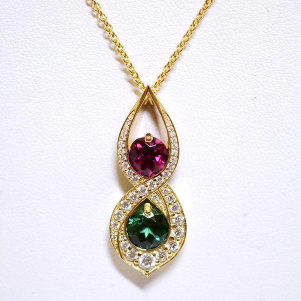 Lady's yellow 14 karat custom pendant with one 1.29ct round pink tourmaline, one 1.41ct round green tourmaline and 0.73ctw round G VS2/SI1 diamonds.