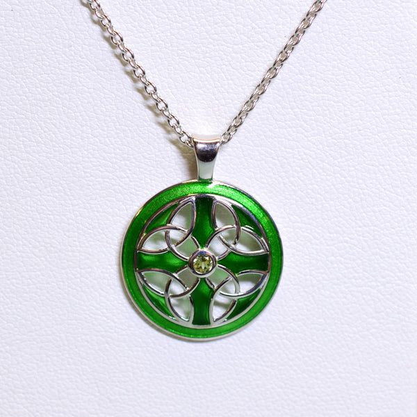 Sterling silver green plique-a-jour Celtic cross necklace with peridot. Necklace comes with adjustable 20 inch rolo chain. Made by Nicole Barr.