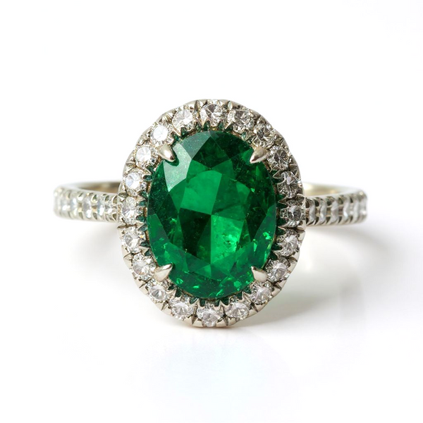 Lady's white 14 karat halo fashion ring with one 2.64ct oval emerald and 36=0.60tw round G SI1/SI2 diamonds.