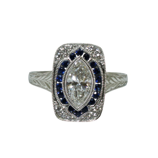 Lady's white 14 karat fashion ring one 0.72ct marquise D VS2 diamond, 18=0.28tw round sapphires and 12=0.09tw round G VS2/SI1 diamonds.