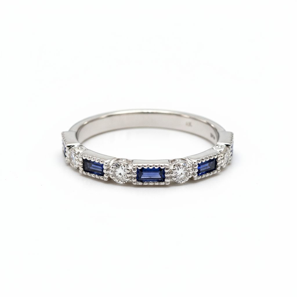 Lady's white 14 karat fashion ring with 4=0.07tw round G SI1 diamonds and 5=0.34tw baguette sapphires.