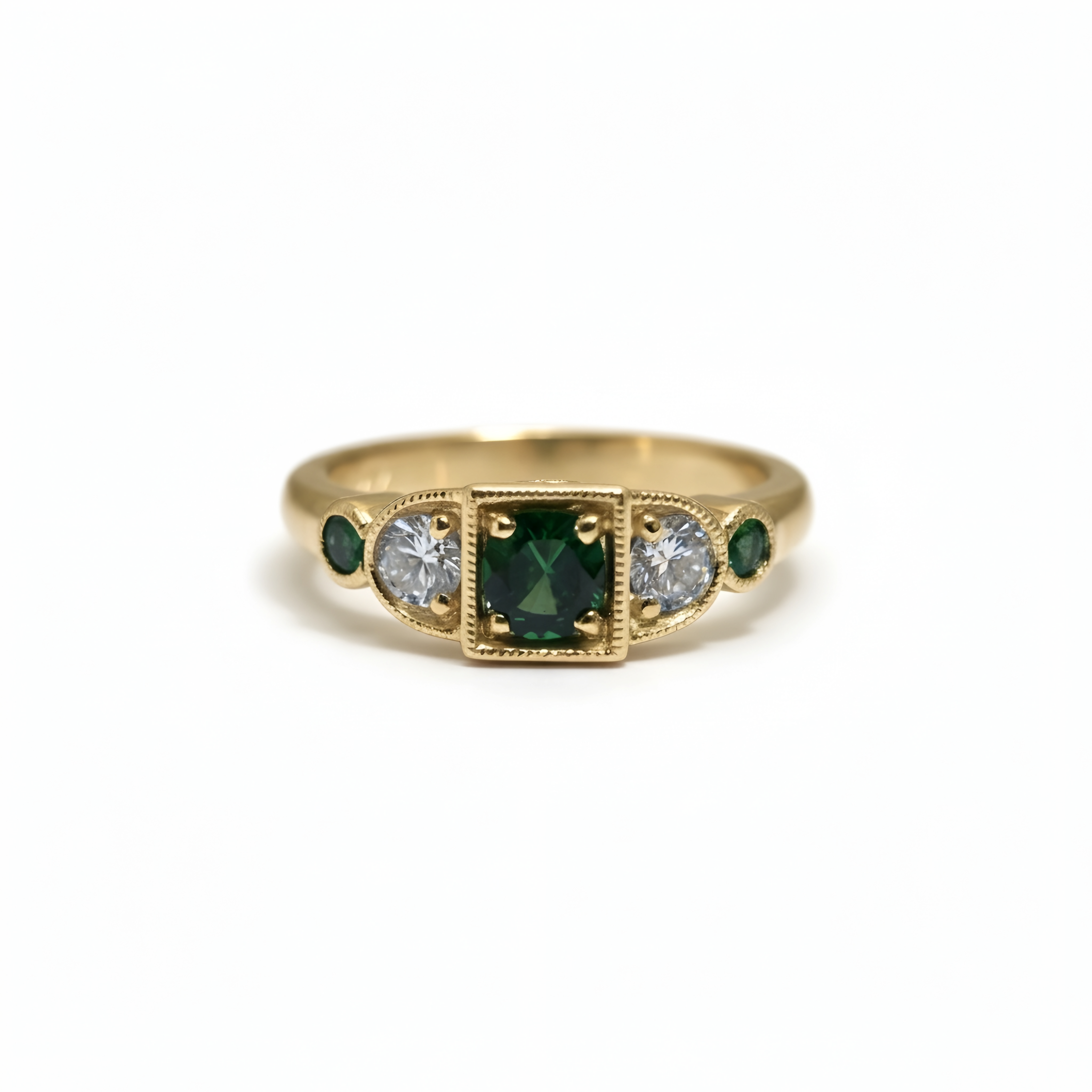 Lady's yellow 14 karat Art Deco style fashion ring with one 0.34ct round Tsavorite garnet, 2=0.20tw round G/H VS2/SI1 diamonds, 2=0.10tw round Tsavorite garnets, and 2=0.04tw round G/H SI1 diamonds.