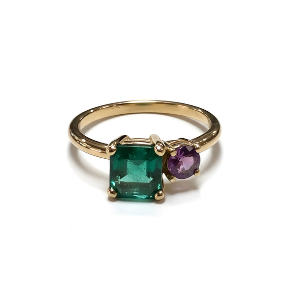 Lady's yellow 14 karat fashion ring with one 1.20ct square emerald cut emerald and 1=0.37ct round pink sapphire.