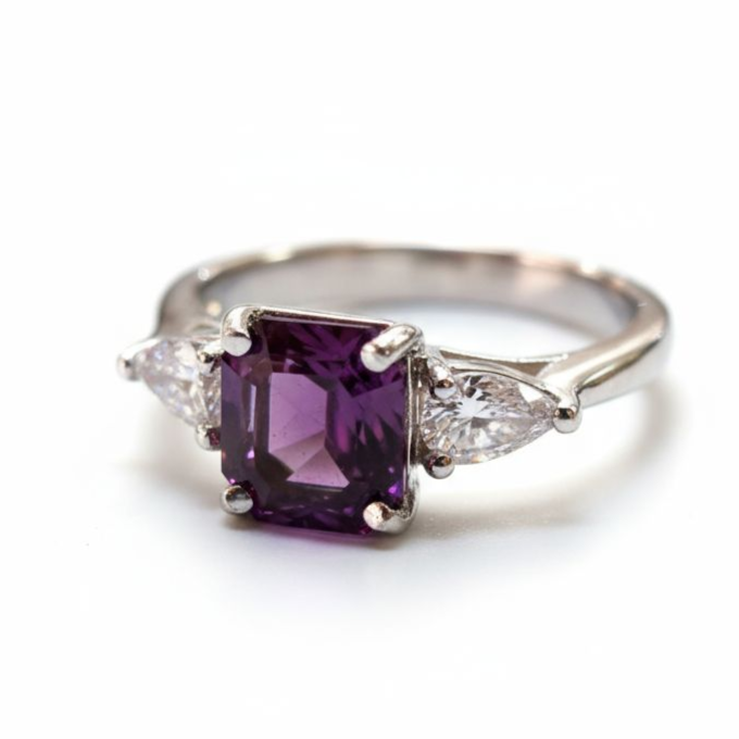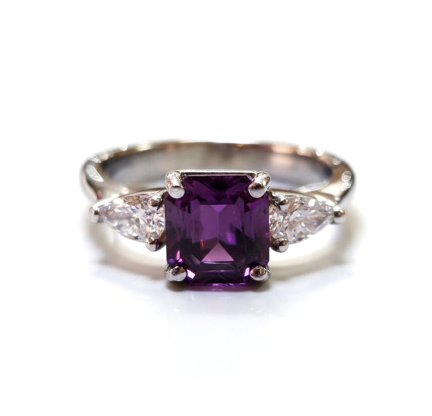 Lady's white 14 karat custom ring with one 1.83Ct cushion Umbalite Garnet And 2=0.44Tw lab grown pear D/E Vs1/Vs2 diamonds.