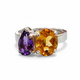 White sterling silver ring with one 2.49ct oval citrine and one 1.17ct pear amethyst.