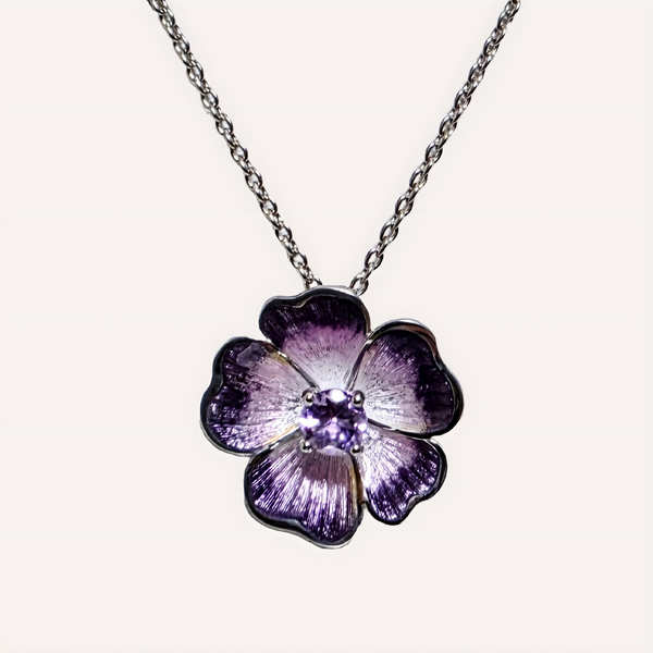 Sterling silver purple flower necklace with amethyst. Adjustable 20 inch rolo chain.
